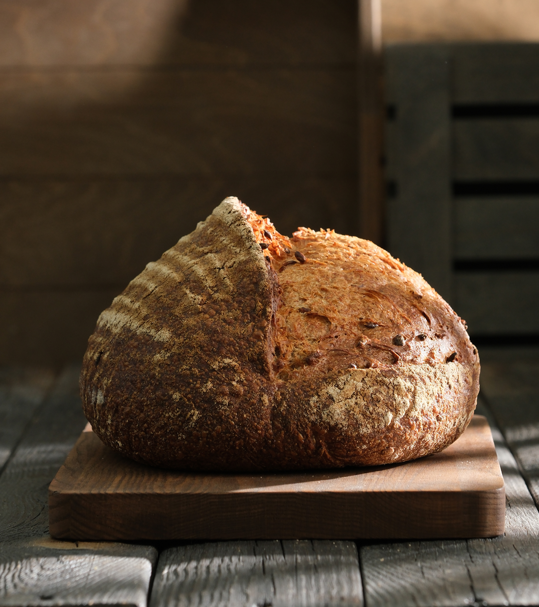 Хлеб с ярким ароматом живой закваски, хрустящей корочкой и упругим, хорошо развитым мякишем. Осолодованное зерно ржи формирует красивую структуру, насыщает изделие витаминами группы В и клетчаткой.